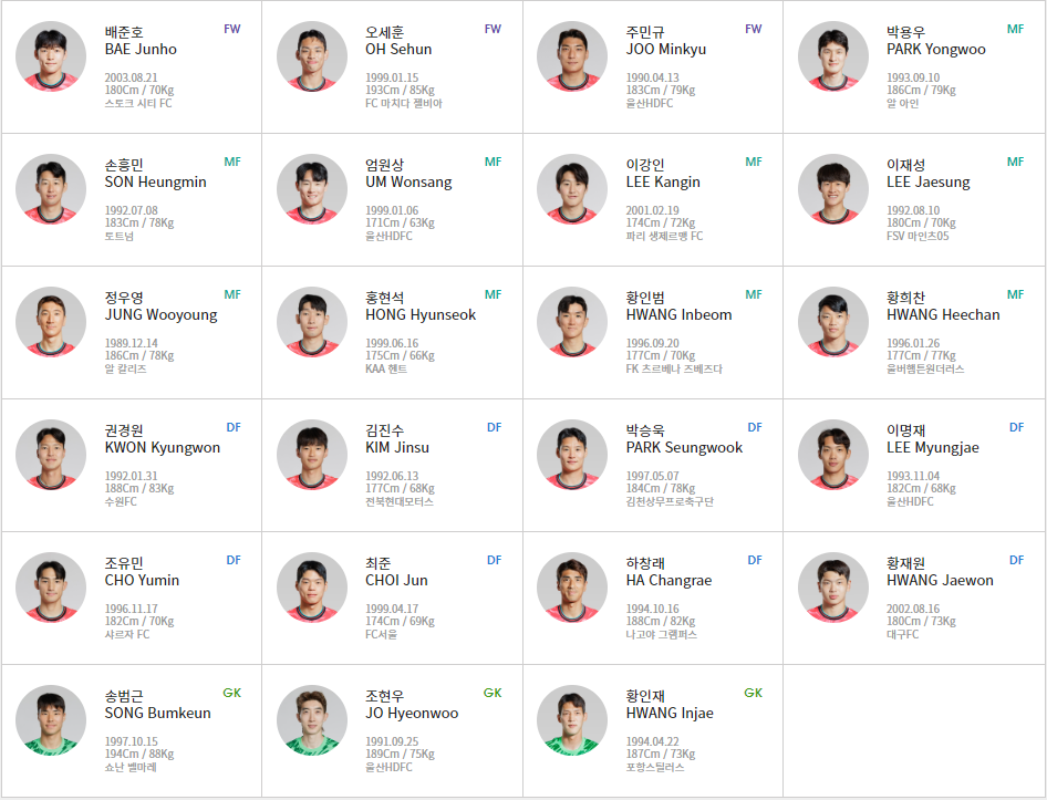 MF_ 손흥민, 엄원상, 이강인, 이재성, 정우영, 홍현석, 황인범, 황희찬