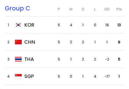 현재까지 기록은 한국이 4승 1 무(승점 15)로 1위, 중국이 승점 8점으로 2위,