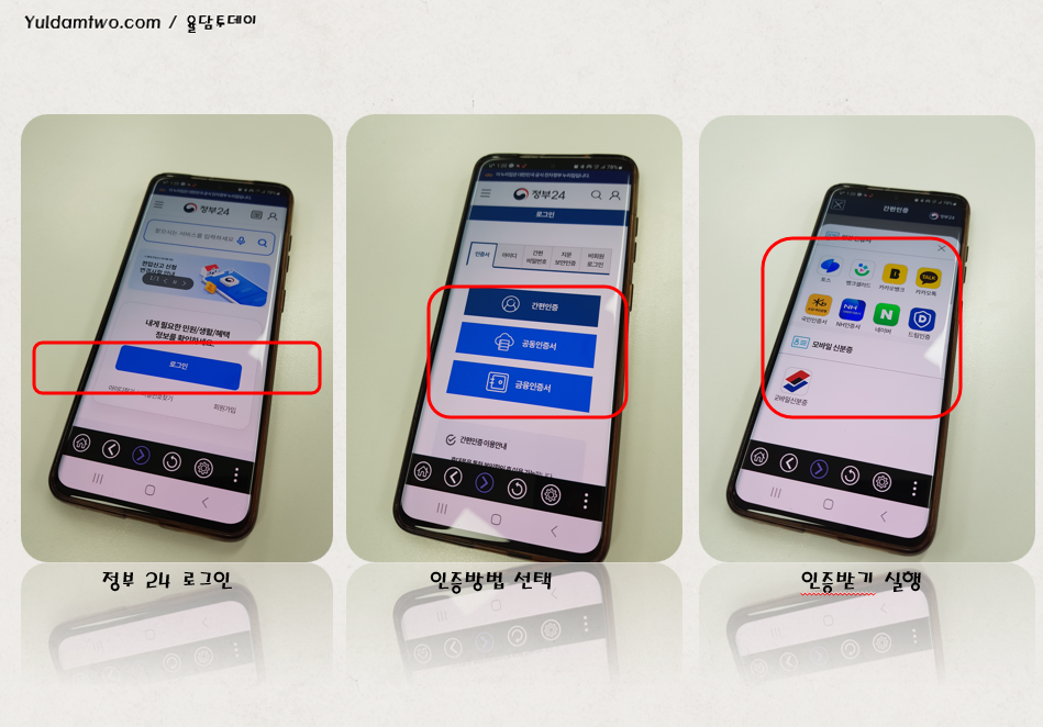 - 정부 24 앱 설치 → 로그인 → 인증밥법 선택하기 →간편 인증, 공동인증, 금융인증 →인증밥법에 따라 인증하기