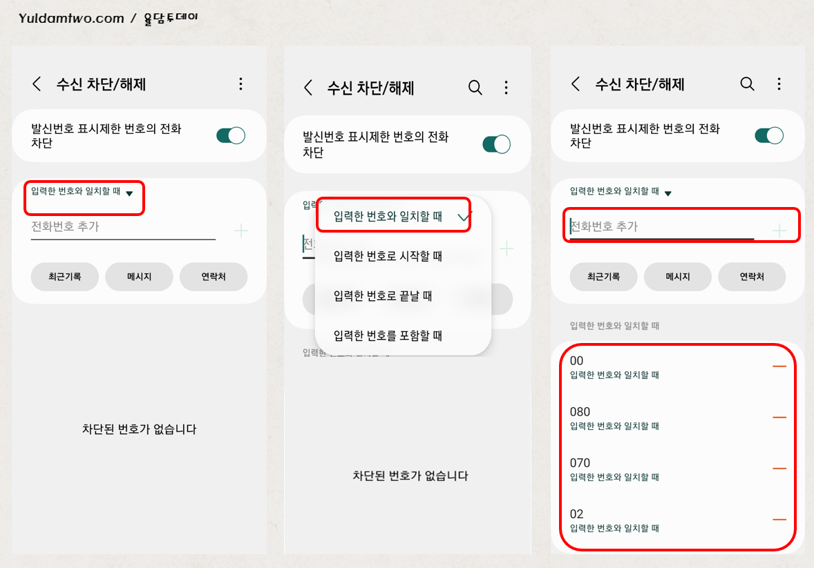 7. 수신차단/해제를 활성화되었으면, [입력한 번호와 일치할 때] 버튼을 누르세요.