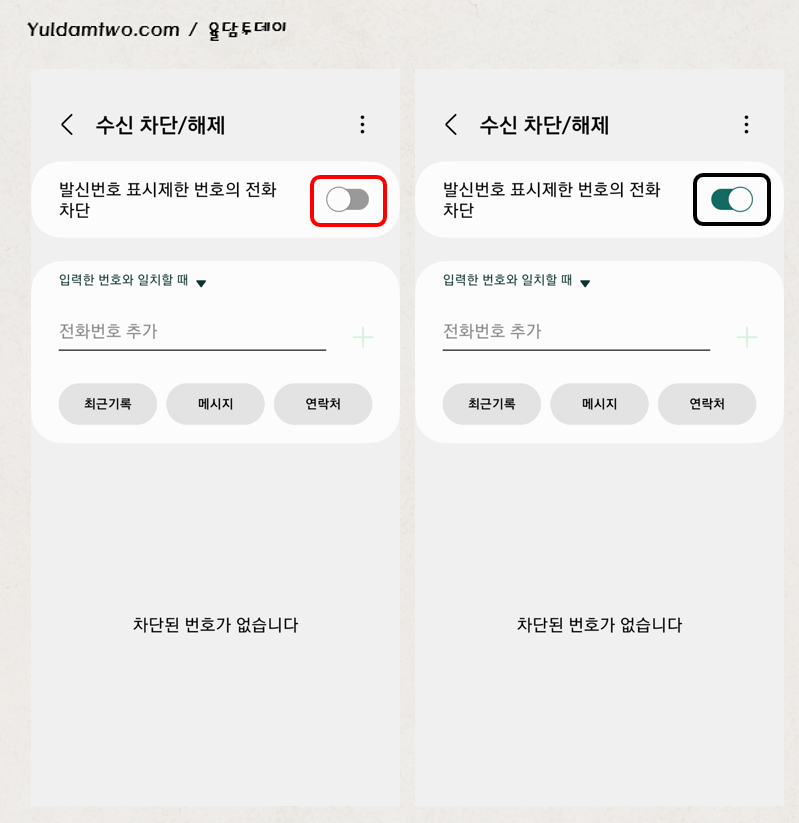 5. 왼쪽의 그림에서 수신 차단/해제 화면으로 옮겨집니다.