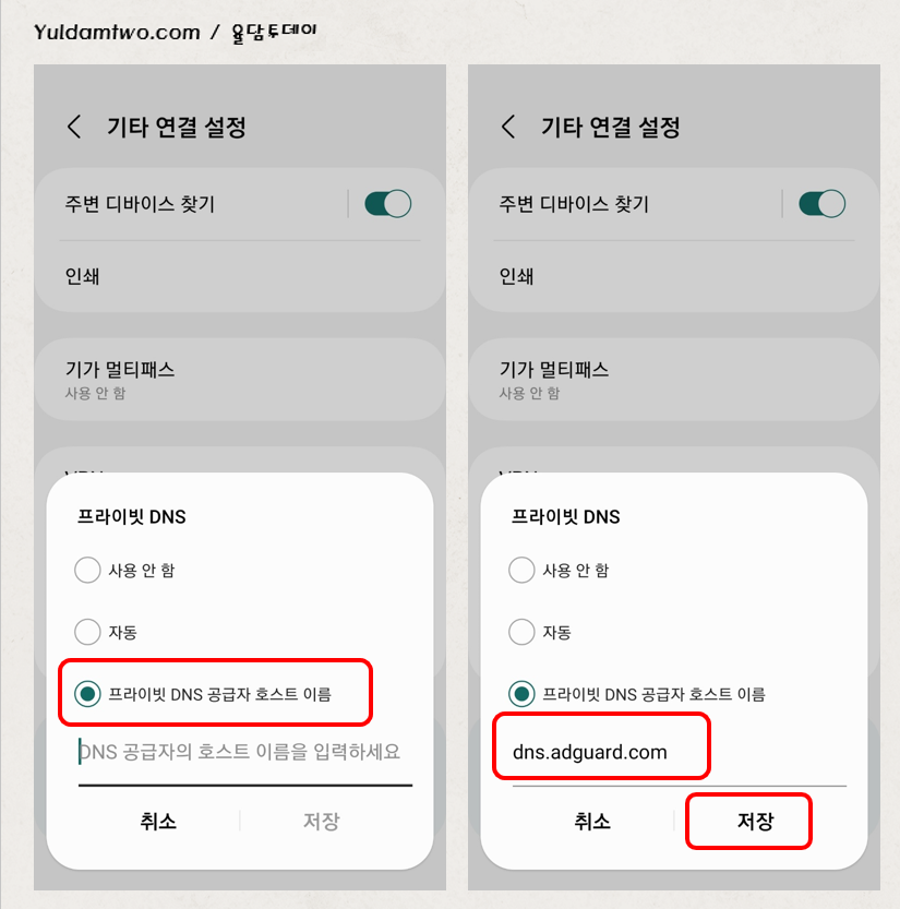6. [dns.adguard.com]을 입력한 뒤 저장을 클릭합니다.