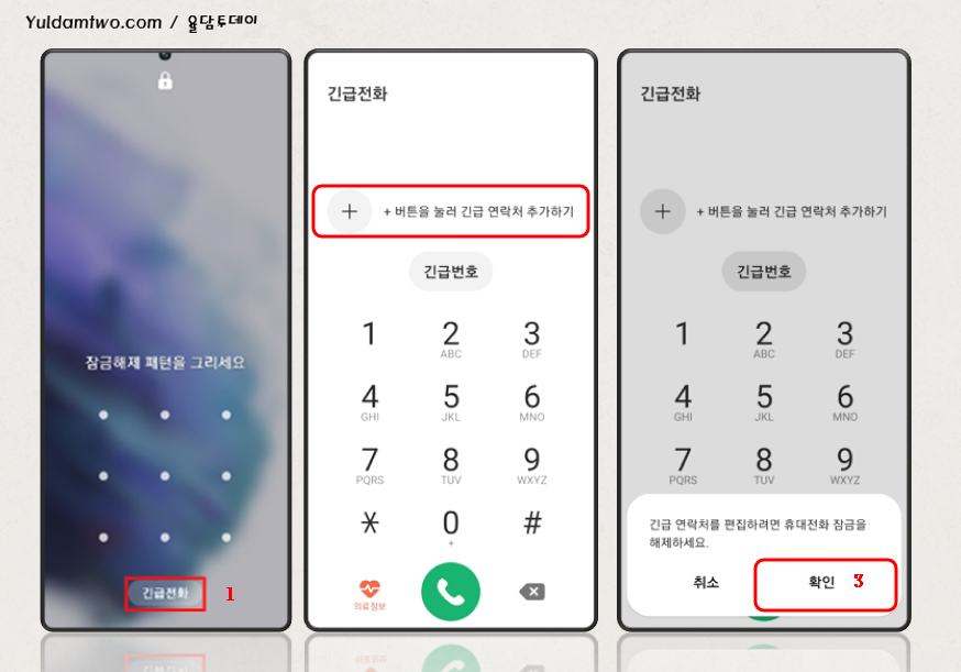 - 스마트폰의 잠금을 풀지 않고도 잠금화면에서 설정해 놓은 긴급 연락처로 전화할 수 있는 기능입니다.