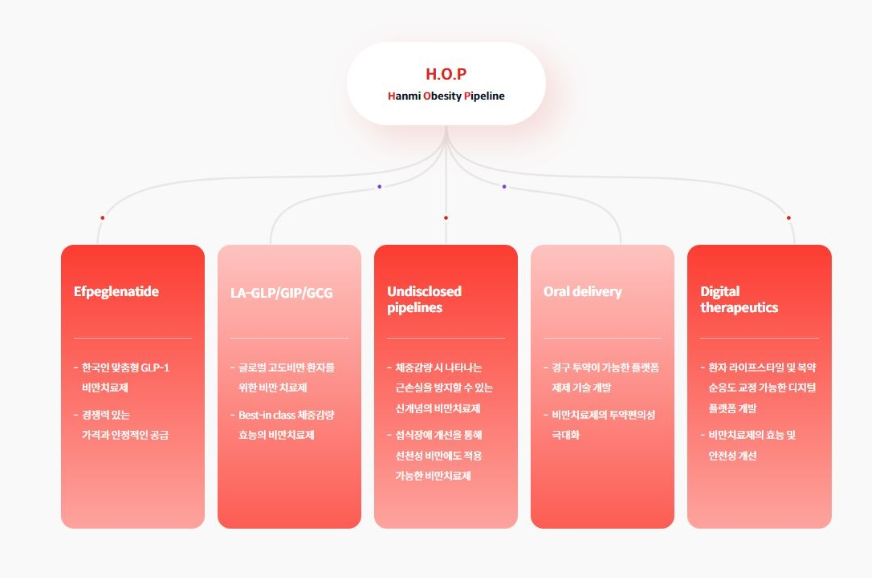 H.O.P 프로젝트에는 에페글레나타이드 외에도 수술적 요법에 따른 체중 감량 효과(25% 내외)에 버금가는 강력한 효과를 확인한 LA-GLP/GIP/GCG(코드명 : HM15275), GLP-1 제제 사용 시 나타날 수 있는 근육량 손실을 방지해 체중 감량의 퀄리티를 개선하고 요요 현상 억제에 도움을 줄 수 있는 바이오신약, 섭식장애 개선제, 경구용 비만치료제, 비만 예방과 관리에 적용할 수 있는 디지털치료제 등이 포함돼 있다.